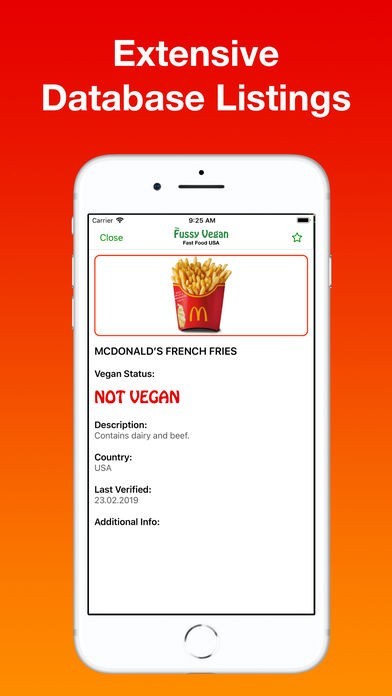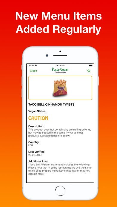 The Fussy Vegan Fast Food USA app was developed by the creators of the Fussy Vegan Website and apps as a way to easily find vegan options at fast food outlets around the USA. All menu items and ingredients listed in our database have been verified with the relevant company to ensure accuracy.
