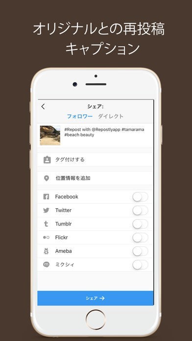それぞれの所有者の許可なしに写真を再投稿するには、このアプリを使用しないで下さい。 Instagramのユーザーの権利を尊重します。