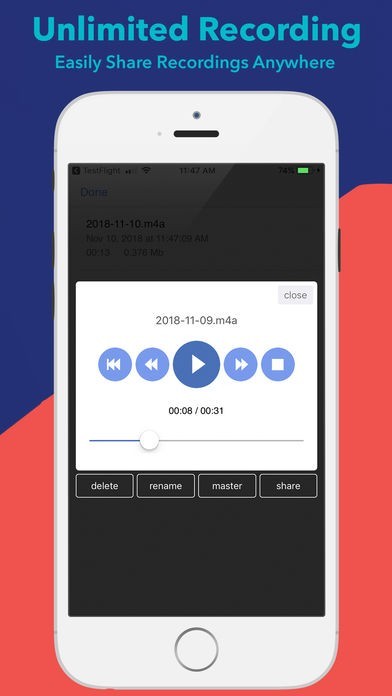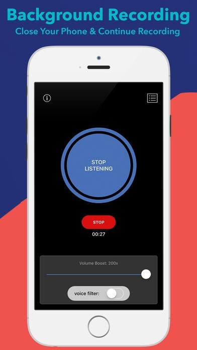 Hear Boost はバックグラウンドで動作するので、モニターや録音中にディスプレイをオフにしてどこにでもデバイスを置くことができます。録音には制限はありません。停止するか、空き容量が足りなくなるまで録画を続けます。