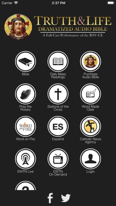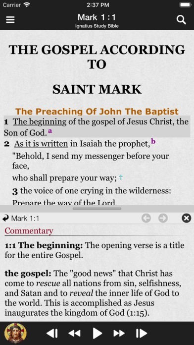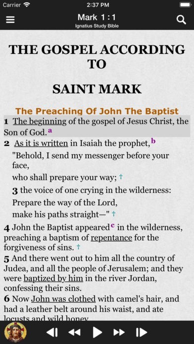 In addition to the complete RSV Second Catholic Edition Text (RSV-2CE), the app includes the audio for the Gospel of Mark and FREE selection from the Ignatius Catholic Study Bible for the Gospel of Mark. At any time you can purchase the full New Testament Audio and the full Ignatius Catholic Study Bible (New Testament and an ever-expanding list of Old Testament books), annotated by Dr. Scott Hahn and Curtis Mitch. The Ignatius Catholic Study Bible includes superb notes, essays, and commentary, as well as a doctrinal index.