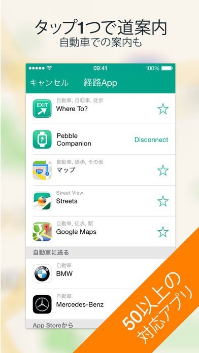 行き先が決まったらアプリ内からタップ操作のみで行き先の場所までの自動車案内をスタートさせることができます。連携されているナビアプリはGoogleマップの他に50以上あるので、使いやすいものを選択することができます。