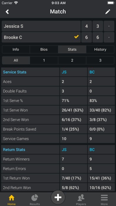 unforced, forced errors, winners, breakpoints, percentage of 1st and 2nd serve won and a lot more. Walk on a tennis court and start tracking your matches with a few taps.