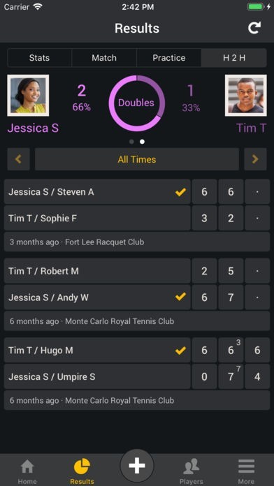 Review your match and practice results. Head to Head, All time or by year. Indoor, Outdoor, Surface, Time on Court, Locations, Tie-Breaks, Deciding Sets, After Winning 1st Set, After Losing 1st Set, vs Right and Left Handers
