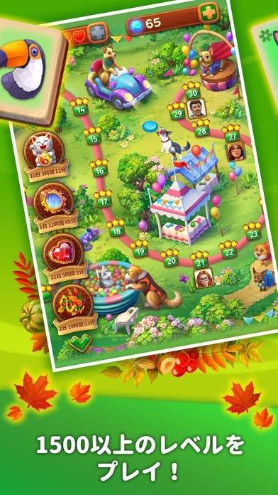 ぱずじゃんは、かわいい絵柄の牌が特徴で、同じ絵柄を選んで消していくゲームです。ポップな感じが好きな方は、麻雀をパワフルに遊べます。同じ絵柄を探して牌を揃えていきます。手詰まり時は、シャッフルします。配置を変えてペアになる牌を探します。ボタンをタップして、アイテムを使うことができます。レベル機能があります。1300以上遊ぶことができ、ヒントやアイテムを使うと難しくなってもクリアできます。世界を旅行するストーリーが楽しく、ステージをクリアすると1マスずつ進めるので、コツコツと時間をかけて遊べます。友達の進み具合もコマで確認でき、競争し合ったり励まし合ったりして仲良く遊べます。