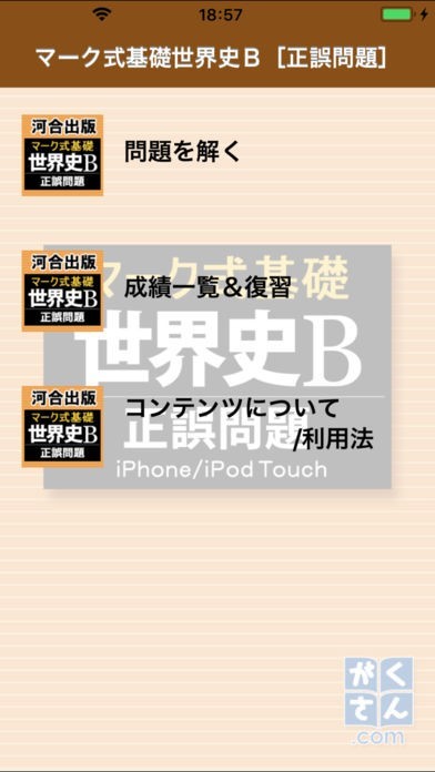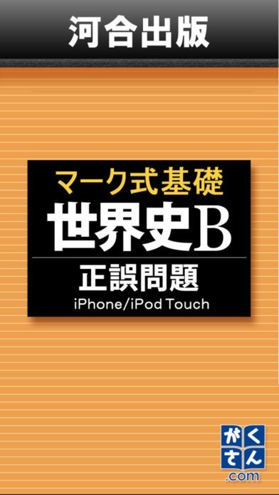「マーク式基礎世界史B[正誤問題]」は、センター試験と私大の“短文正誤判定問題”に対する対策問題集である株式会社河合出版発行「マーク式基礎問題集31 世界史B[正誤問題]」を元に作成されたiPhone/iPod touch向けのアプリケーションです。
