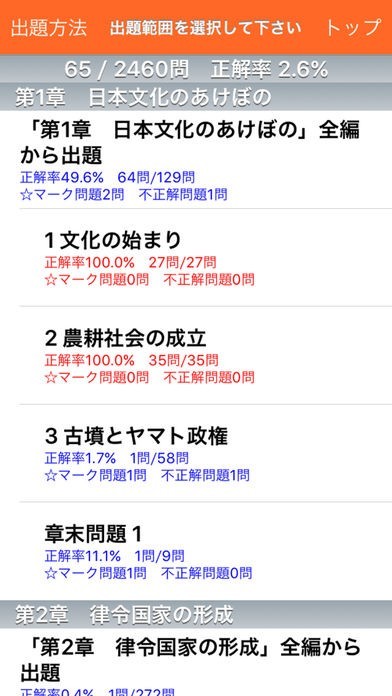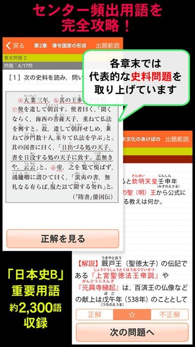 このアプリでは、センター試験で出題が予想される範囲のほぼ全てをカバーしています。また、テストでは他のアプリには無い史料を扱った問題も出されるので、試験にむけてバッチリ対策を行うことが出来ます。