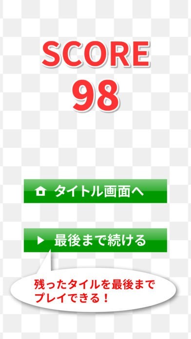 タイムアップ時に表示される「最後まで続ける」ボタンを押すと、全てのカラータイルを獲得するまでプレイを続けることができます。全カラータイルを獲得するまでのタイムを測定できます。