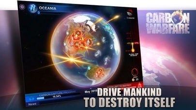 「Carbon Warfare」は地球を破壊することが目的の、ちょっと危険なシミュレーションゲームです。人類に二酸化炭素を排出させて、温度を上げさせて、厄災を世界に解き放ちましょう!