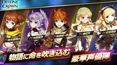 デスティニーオブクラウンは、壮大な世界観と魅力的なキャラクターが織りなす、シミュレーションRPGです。個性豊かなキャラが続々登場するデスティニーオブクラウンのメインシナリオは、なんとフルボイスで収録され、迫力満点に展開する物語を更に盛り上げます。バトルパートには3Dマップシステムが搭載されており、配置が勝利のカギを握る、緊張感のあるバトルが楽しめます。キャラクターの特徴を活かした戦略を立て、強力な敵を倒し、デスティニーオブクラウンのストーリーを追っていきましょう。