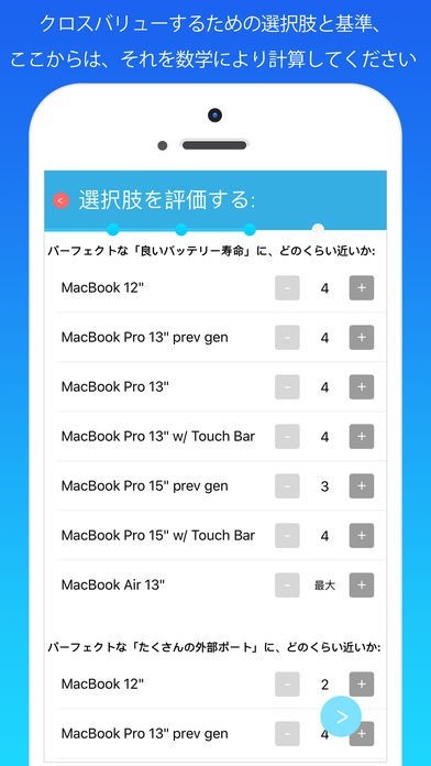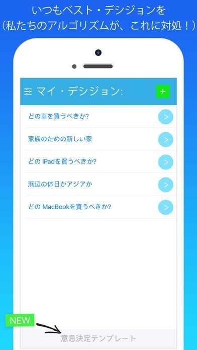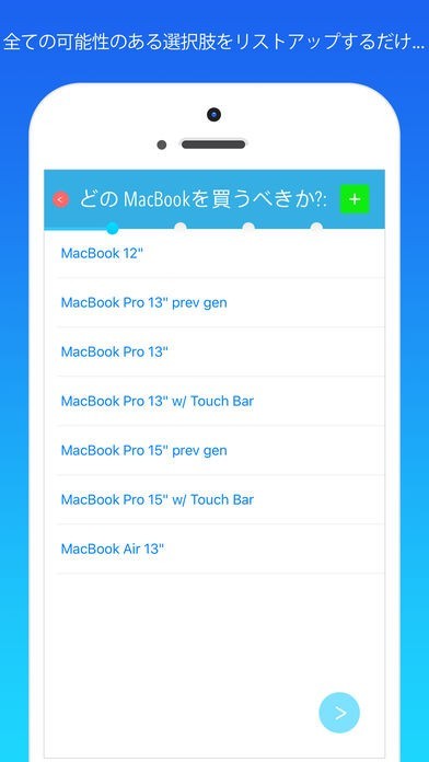 App Storeより引用新しいMacBookの購入をお考えですか? 家族にぴったりの物件をお探しですか? 休暇は南国ビーチで? それともアジア旅行? 選択するときはいつも最善の決定をしましょう! Best Decisionはとても簡単に使えるアプリです。客観的にどの選択肢が最善かを示し、そこから希望の選択肢を"あなた"が選びます。