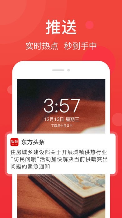 App Storeより引用东方头条是一款智能的新闻资讯聚合的头条新闻软件,它基于数据挖掘,为用 户推荐今日头条新闻、 国内国际快讯、娱乐新闻、新闻资讯、财经新闻及各个 类型的热点新闻资讯。