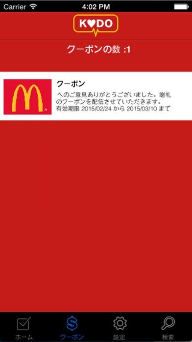 お気に入り店舗に登録すると次回から検索する手間が省けます。ホームや検索画面で店舗を左にスワイプでお気に入りに登録完了です。クーポン画面にゲットしたクーポンが表示されます。クーポン期限は、回答した翌日から2週間です。全国のマクドナルドを検索できるので、出張の際に事前にアンケートに回答すれば、出張先のマクドナルドの無料クーポンをゲットする使い方もありです。