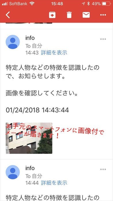 月額コースでは、緑色をキャッチすると同時に5秒間隔で画像付きメールが送られます。日時も一緒に送られてくるので現在の状況を把握しやすく、駐禁対策にはぴったりです。