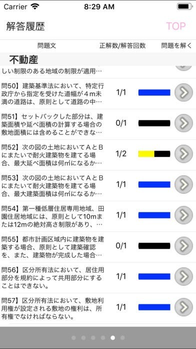 解答履歴では、正答率70%以上は青、40%以上は黄、それより低い場合は赤と色分け表示されるので、苦手な