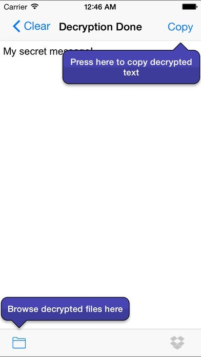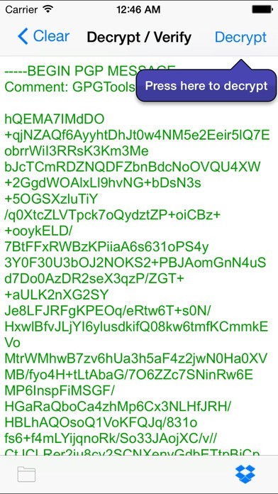 - Files (.pgp or .gpg files) "Decryption / Verify" and "Encryption & Sign" through iOS Documents interation (ex: iOS Mail.app -> oPenGP), Email, Photos, Dropbox, "My Files".