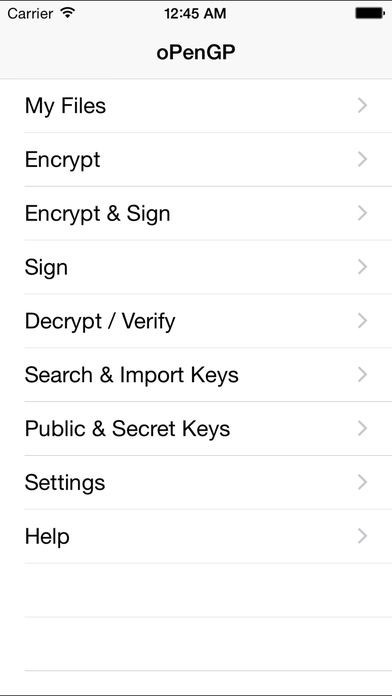 - Local folder "My Files", to store encrypted documents inside oPenGP, can be managed through iTunes file sharing.