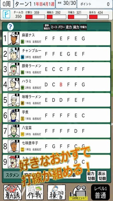 選手ごとの守備や打順の適正、さらには成長しやすさ、くさりやすさなど多彩なパラメータを用意。