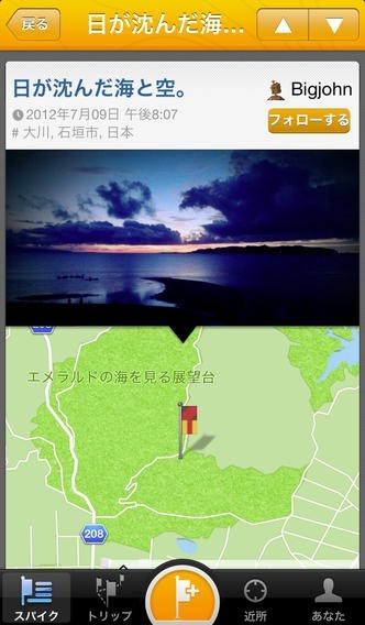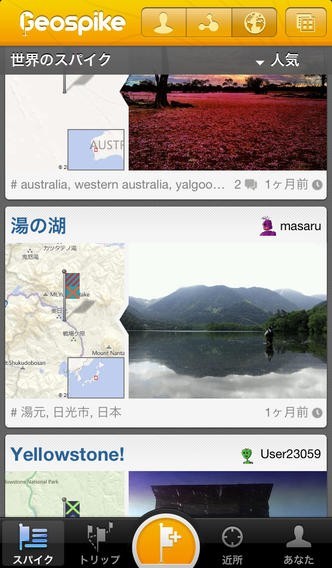 Geospikeというのアプリはこのアプリを使っているユーザーが世界中から自分が撮影したものを投稿して それもコメント付きで投稿をするのでこのアプリを使っている人が楽しく世界中の楽しいスポット情報を共有できるというのがあります。 これでそれまで知らなかった事がない行ってみたいと思える場所を知る事ができます。