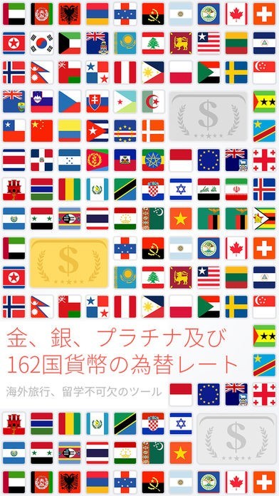 「為替情報 - 通貨両替電卓 - レートー世界の全ての為替」は、各国通貨の為替レートを表示してくれるアプリです。ドルやユーロといった主要通貨はもちろん、ウェブサイトではあまり見る機会のないマイナー通貨まで160を超える為替レートを確認できます。貴金属の価格も見られるので、投資情報を知る目的にも活用できます。