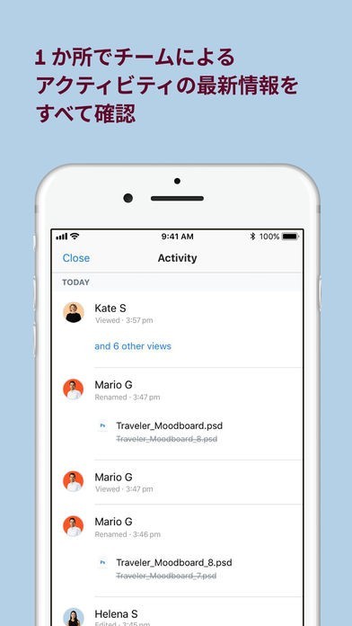 複数人が参加するプロジェクトには、ワークスペースとして活用できる「Dropbox」が便利です。クラウドストレージ内に共有フォルダの作成が可能。プロジェクトメンバーで同じ資料を共有することで、情報の齟齬や伝達漏れを防止することができるでしょう。コメント機能も搭載しており、共有メンバーはファイルに間違いがあった場合や、新しいアイディアを伝えたい場合には、コメントや注釈を手軽に残すことができます。また、ドキュメントスキャナー機能も業務の進行に役立ってくれます。アプリからカメラを起動して、ノートやホワイトボードを撮影するだけと操作も簡単。会議で使用したホワイトボードをデータ化し、記録として残してみてはいかがでしょうか。