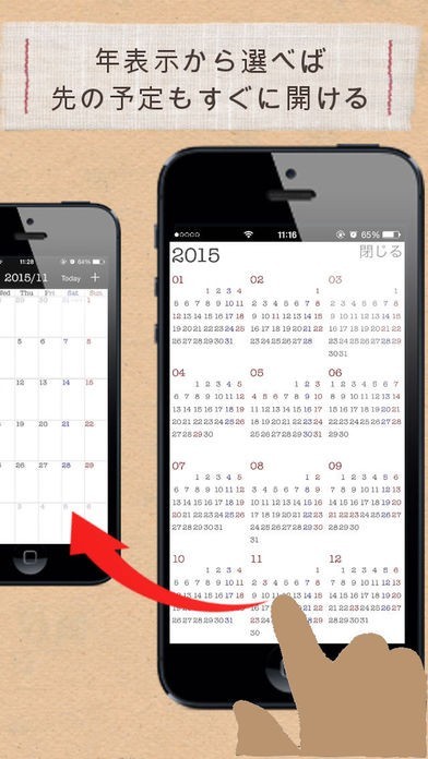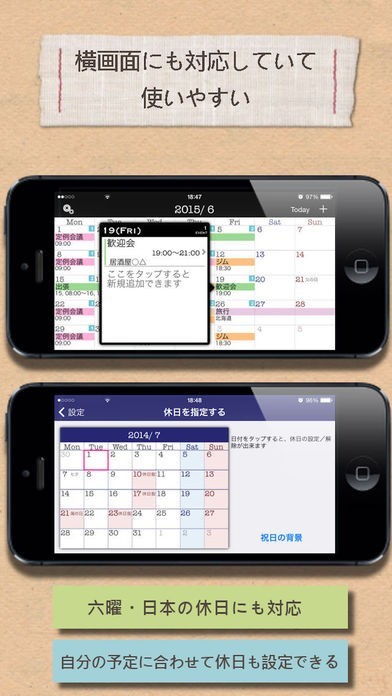 紙のカレンダーと同じように、文字の色や大きさを選びながら予定表に予定を書き込んでいく事ができます。画面は縦だけでなく横にもできるので見やすく便利です。紙の手帳を持ち歩く必要がなくなります。
