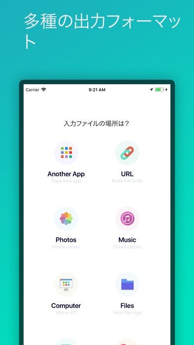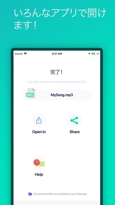 アプリ内ファイルブラウザやiOS 11のアプリ Filesを通して,変換後のすべてのファイルへアクセスできます。