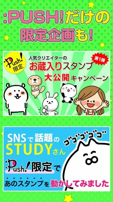 「PUSH! -有名スタンプ取り放題プラス-」は、LINEやSNSで使える人気のアプリが全て無料でゲットできちゃうお得なアプリです。 最近流行りの動くスタンプまでも無料でダウンロードして使用することができます。ダウンロード後は直接LINEやSNSに送れます。 スタンプをデザインしたクリエイターたちの情報も満載です。