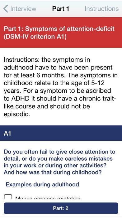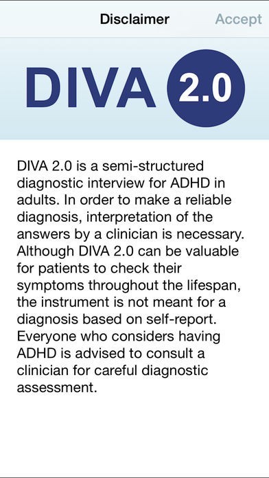 App Storeより引用The DIVA App contains the Diagnostic Interview for ADHD in Adults (DIVA 2.0). It adds the total number of symptoms in both childhood and adulthood, to investigate the diagnosis of ADHD according to the DSM-IV criteria. After assessment, the data will not be stored, but send as both text and SPSS file by email.