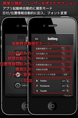 日付/位置情報自動的に記入 - 設定でオン/オフ切り替えが可能です。