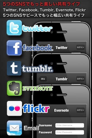 Twitter, Facebook, Tumblr, Evernote, Flickr 5つのSNSサービスとメールでもっと幅広い共有ライフを手軽に楽しめますよ。