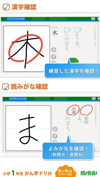 小学1年生で習う漢字80文字の読み方、書き方、書き順まですべてアプリで学習することができます。読み方は音声で発音を確認できるので1人で楽しく漢字学習をすることができます。