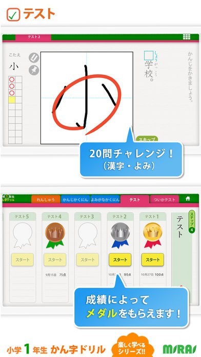 子どもが楽しく漢字学習ができるように工夫されており、成績によってメダルをもらえたり、漢字を書き順通りに綺麗に書けるとマルがもらえる機能が付いています。モチベーションがアップし、漢字学習がはかどります。