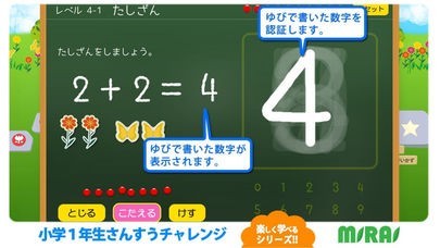 ・黒板に表示される問題の答えを右のボックスにゆびで書きます。数字の書き方も重要なポイントとしていますので、きれいな数字の書き方の練習にもつながります。