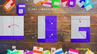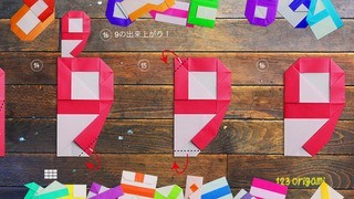「123おりがみ」は折り紙の折り方を紹介する、子どもから大人まで楽しめるiPhoneアプリです。0から9までの数字、+,-,×,÷,=,√,%,:,/,>の記号、全20種類の折り方を紹介しています。