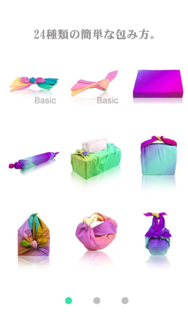 風呂敷の形や大きさに合わせて様々な結び方を表示出来るようになっています。20種類の包み方を紹介しているので、シチュエーションに合わせて風呂敷を活用していけますね。