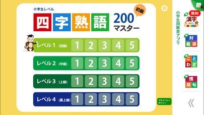 「四字熟語マスター」は、全200語収録されている四字熟語が「初級」「中級」「上級」「最上級」の4つのレベルに分けられているので、易しいものから順番にチャレンジしていくことができます。