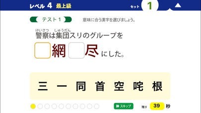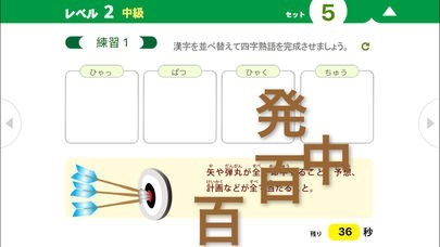 ・各レベルの1セクションにつき10問の四字熟語を学ぶことができます。
