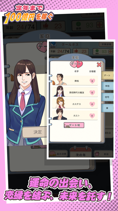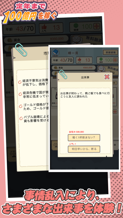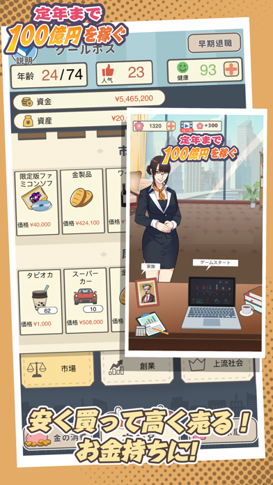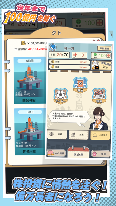 App Storeより引用「定年まで100億円を稼ぐ」は誰もが遭遇するお金をテーマにしたシミュレーション経営ゲームです。
