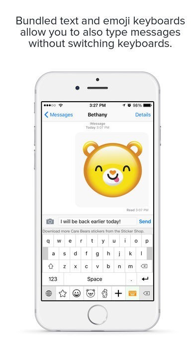 キーボードを切り替える事なくケアベアのステッカーと一緒にメッセージを入力できるようになって標準テキストと絵文字キーも含まれているので便利に使えて良いというのがあります。