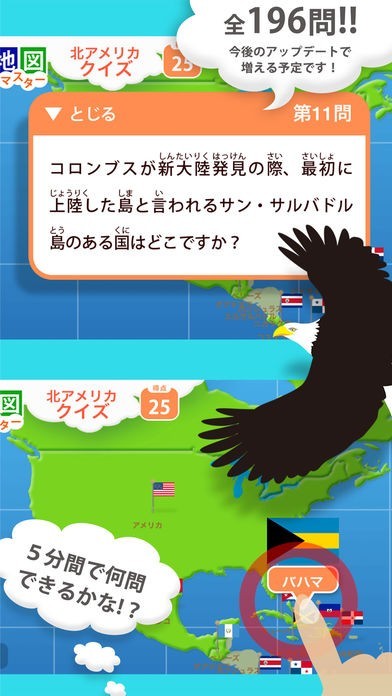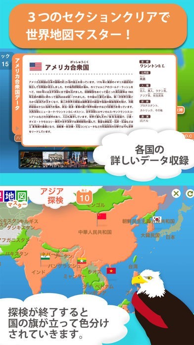 ・子供から大人まで地理が苦手な方でも、アプリを指でタッチすることにより、国の場所や位置関係、特色などを覚えることができます。
