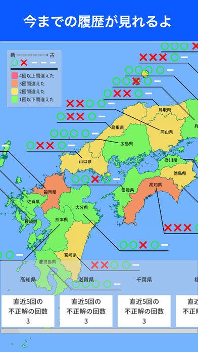 県庁所在地なんて昔学んで、全部覚えていると思っていましたが、結構忘れているものでしっかり復習することができました。履歴が見られるのも復習に良いですね。