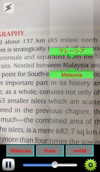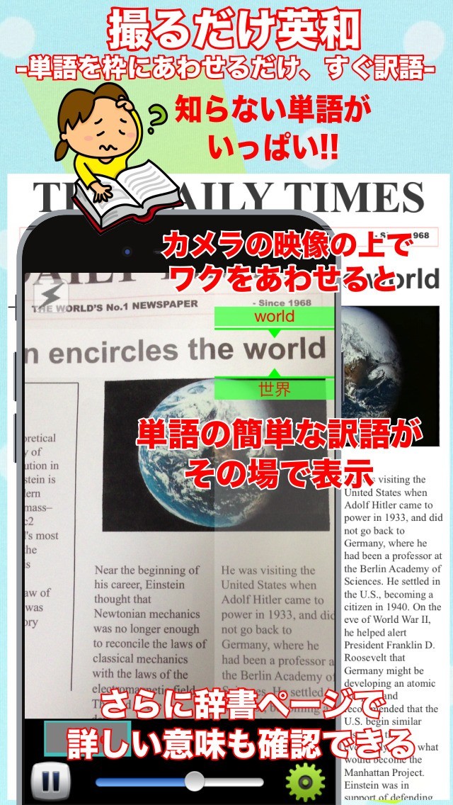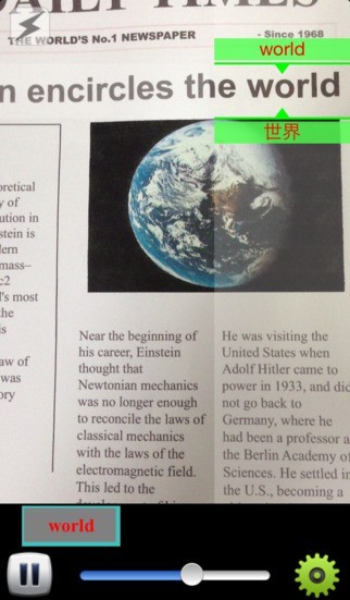 このアプリは わからない英単語をiPhoneのカメラに映すだけで,その文字の意味が映像上に表示されます. これでキーで単語を入力しなくても,素早く意味がわかります。
