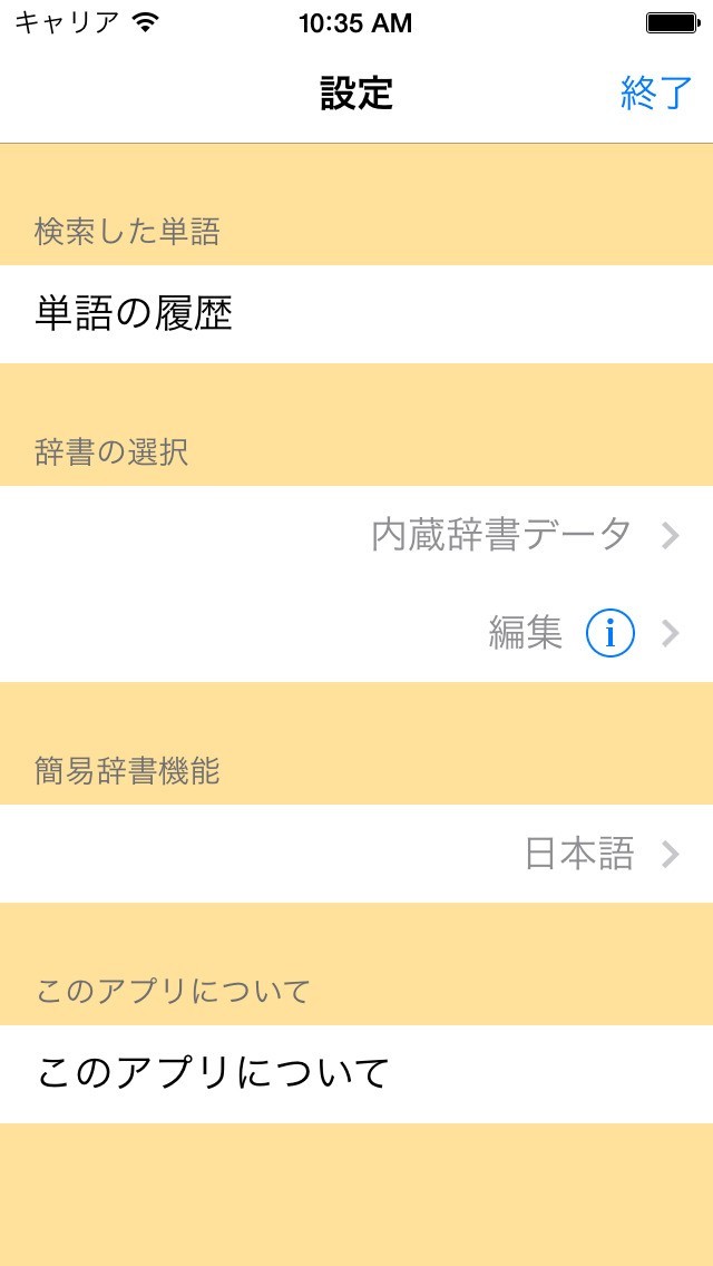 最近検索した単語(30個)は、設定画面から確認でき、そこから詳細な意味を調べることも可能です。