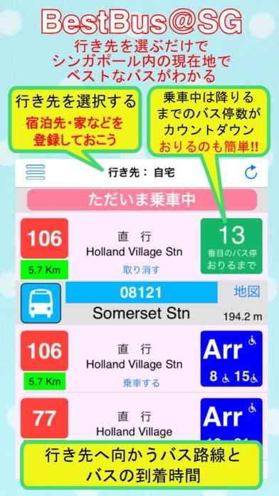 このアプリケーションは、シンガポール市内を移動するのには欠かせないバス移動のさまざまな側面をサポートしてくれる便利アプリです。目的地を入力してどのバスに乗ればいいかがわかります。