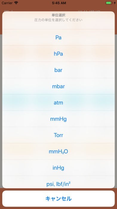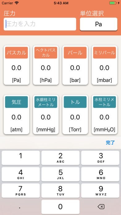 端末の入力画面から圧力の数値を入れ、単位を選択します。画面下部に変換後の数値が表示されるので、必要な項目を参照してください。全部で11種類の単位に対応しています。