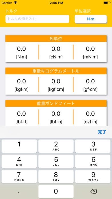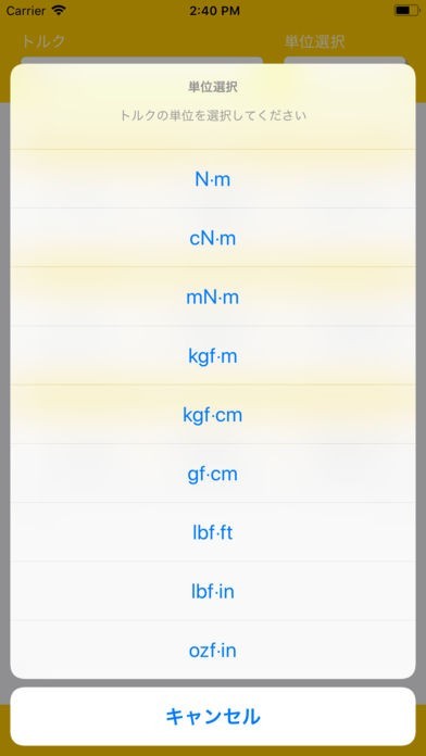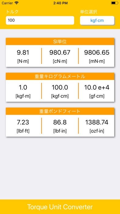 App Storeより引用トルク単位変換アプリは、入力したトルクの値を9つの単位に換算します。換算する単位は、SI単位[N·m]、重量キログラムメートル[kgf·m]、重量ポンドフィート[lbf·ft]などです。トルクの値を入力し、単位選択ボタンでトルクの単位を選択するだけで、9つの単位に換算された値が表示されます。対応している単位は下記の通りです。