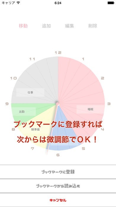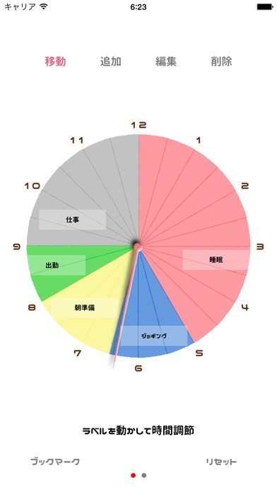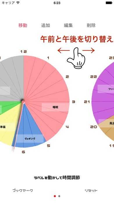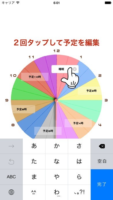 このアプリでは、円で表されたスケジュール表を、「直感的に」指で操作して1日の予定を作成することができます。