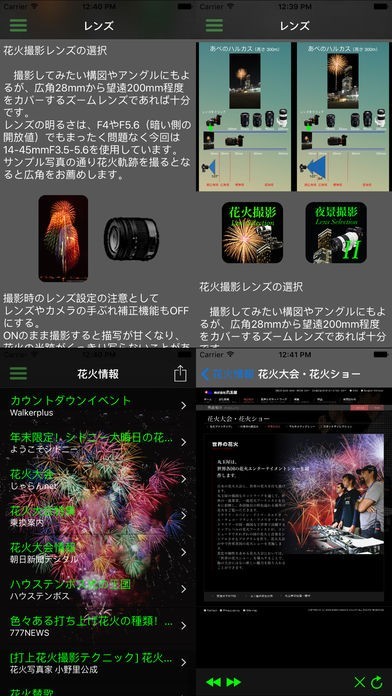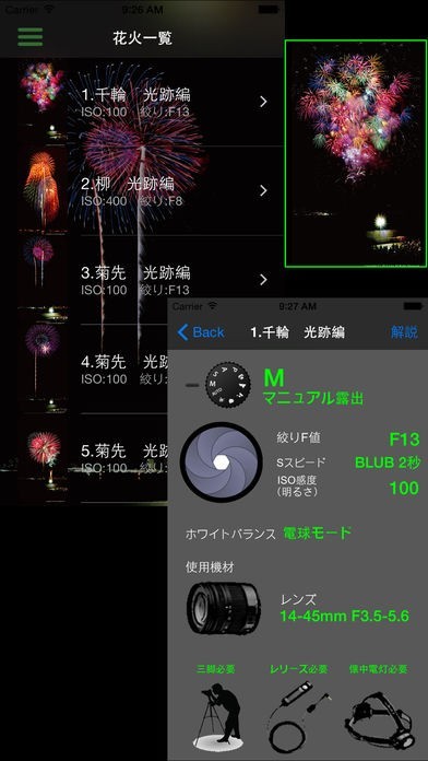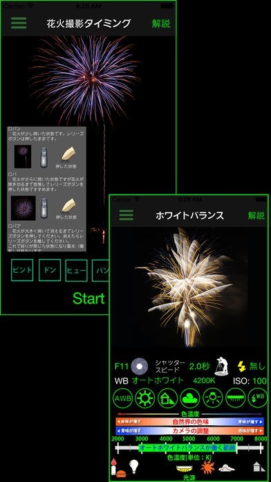 花火と一口にいっても「柳」や「スターマイン」、「菊先」など、たくさんの種類があります。それぞれ発する光が違い、撮影法もバラバラ。ですからアプリでは、花火の種類ごとの具体的な撮影法を紹介しています。