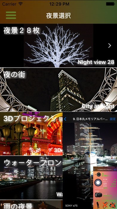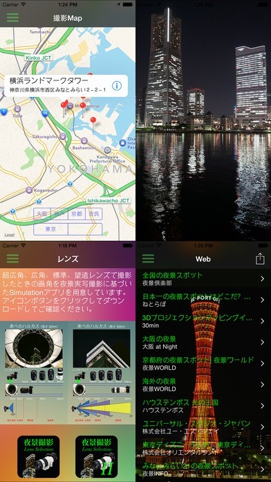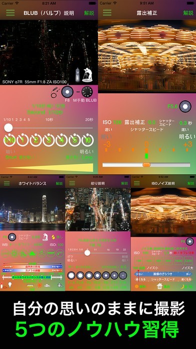 このアプリではテクニックが必要な夜景撮影方法を出来るだけシミュレーション(動く)と音声ガイダンス(撮影例、夜景撮影ポイント、BULB(バルブ)撮影、露出補正、ホワイトバランス、絞り、ISOノイズ、レンズ)にて基本機能を理解しやすいように解説しています。