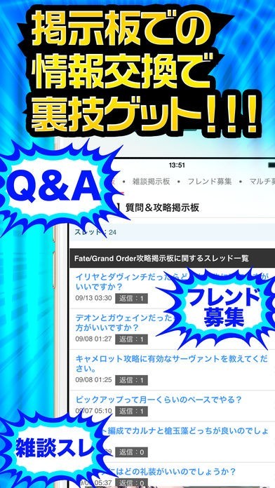 公式ニュースやファンブログの情報以外にも用意された掲示板で意見交換をすることができます。初心者向けのQ&Aから攻略仲間募集まで自由に使用することが可能です。FGOフレンドと雑談をして一緒に盛り上がりましょう。